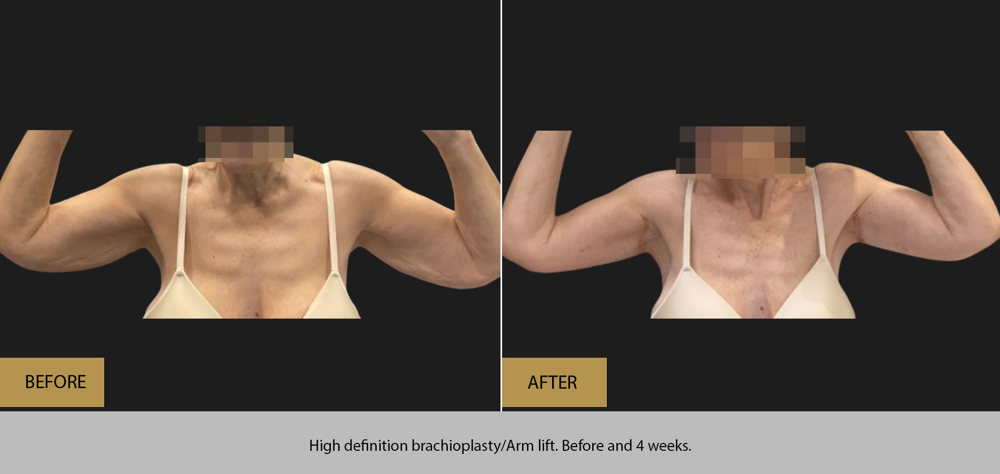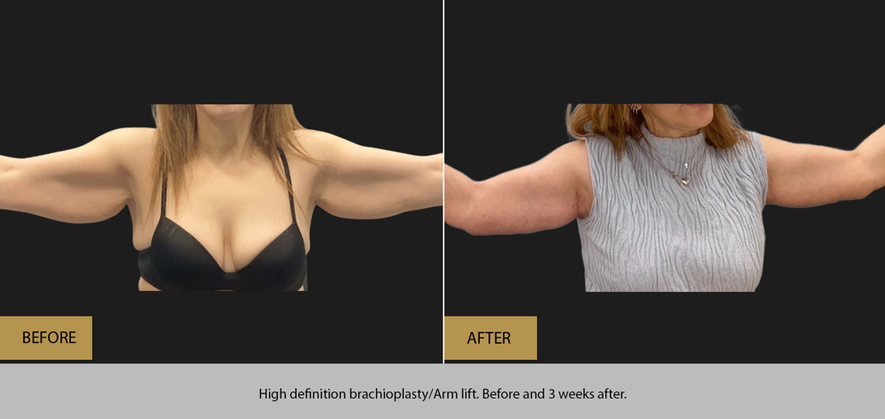 As a person ages, upper arm skin can become loose and flabby. Ultrasound lipolysis (cavitation),cryolypolisis or mesotherapy by phosphotydilicholin/deoxycholate injections may diminish the extra fat. The laxity of the skin can be improved by radiofrequencies (RF) but the best solution will be the arm lift. The brachioplasty can remove the excess skin and fat deposits, leaving the upper arms with a more pleasing and youthful contour.