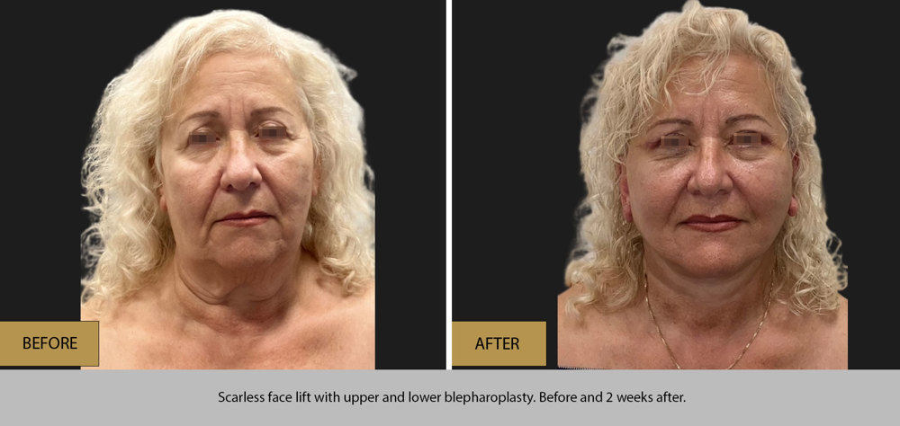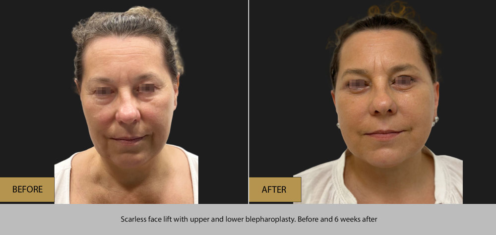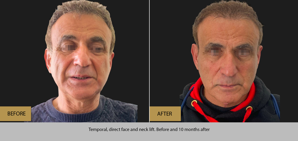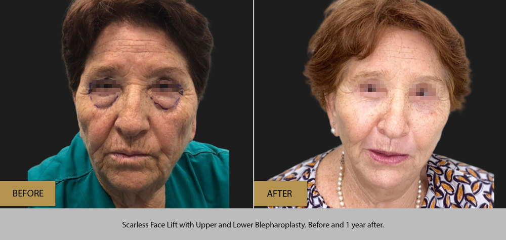 The incisions hardly can be seen even in bald men (men face lift/male face lift/scarless face lift) and the correction of the “hollow eyes” eyes/jaws/nasolabial folds is amazing.
